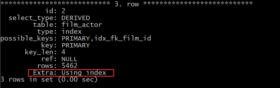 说明:从上面的执行计划来看,这种优化后的方式没有使用临时文件和文件排序的方式了,取而代之的是使用了索引。查询效率老高了。