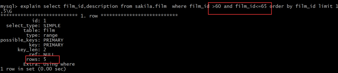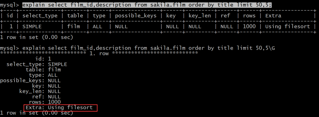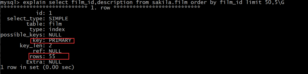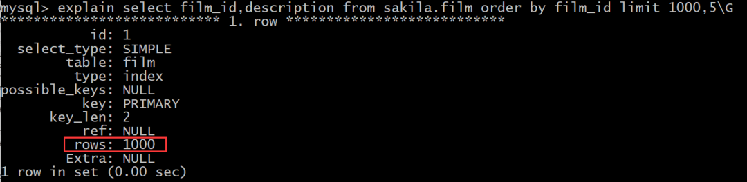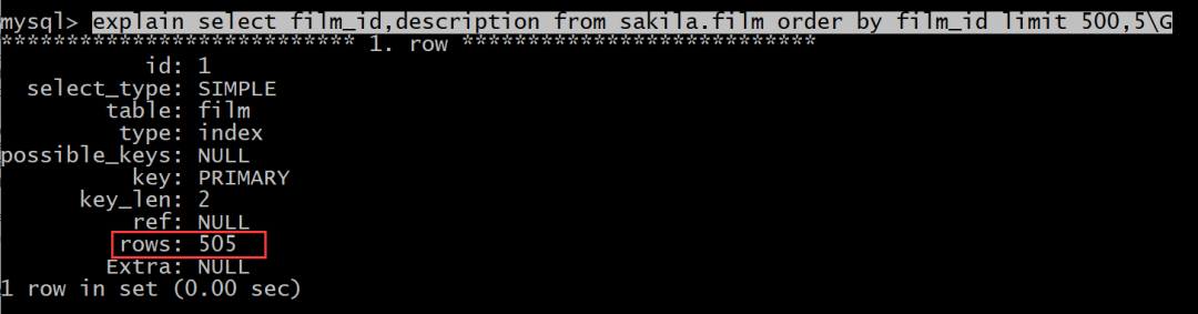 explain select film_id,description from sakila.film order by film_id limit 500,5