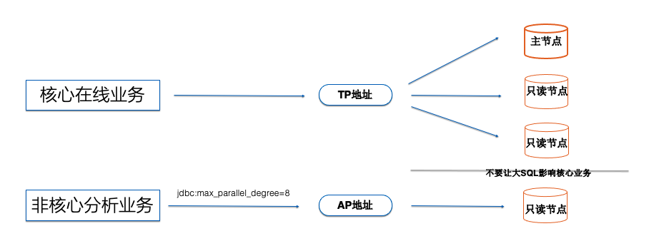 通过Proxy层把不同的业务用不同的连接地址,使用不同的数据节点,避免相互影响。并行查询可以在客户端对指定的SQL开启,不会影响核心业务。