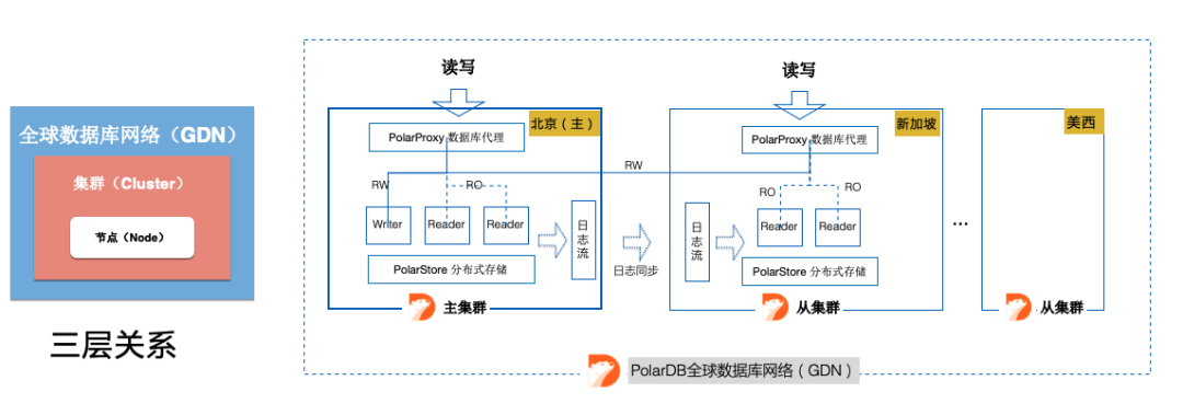 多个PolarDB对外看起来就是一个集群,但所有集群中只有一个能可以写,其它都是可读。最多支持5个集群,集群间数据同步延迟小于2秒。每个集群均支持读写,从集群会把写请求转给主集群,因此集群上的写请求会跨Region,延迟略高。
