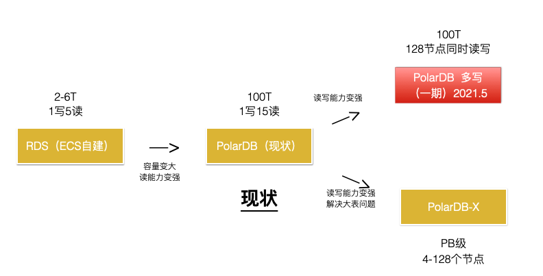 到目前来看PolarDB在架构和性能上都在追求极值。但目前在一些业务开发中,动不动还是能在一个库中搞出来几百张表,SQL编写非常复杂,一个SQL上百,上千行,关联十几张表等情况。在PolarDB 2.0版本引入128个RW节点并行写入,库表写入点秒级切换。对于多节点,并发写入进一步的优化。该功能估计需要到2021年Q3才能上线。