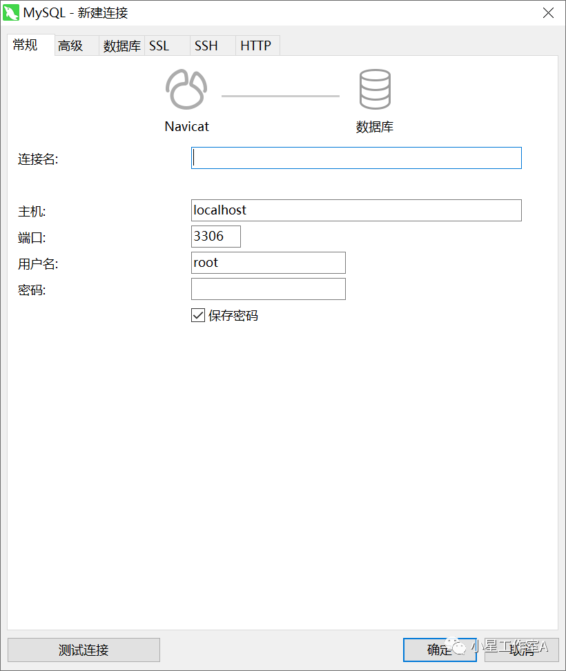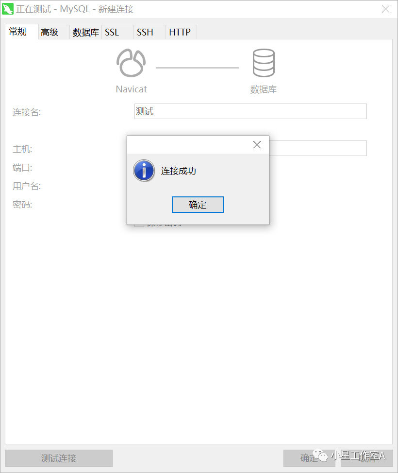 b、填写数据库连接信息;连接名自定义(用于自己辨识)、主机填写数据库服务所在设备IP地址(本机可不作更改localhost)端口用户默认,密码填写修改后的密码。点击【测试连接】提示成功,点击【确定】保存即可。