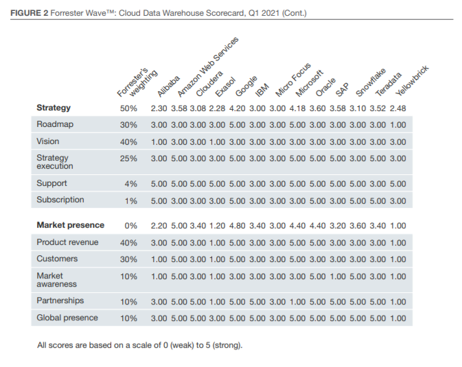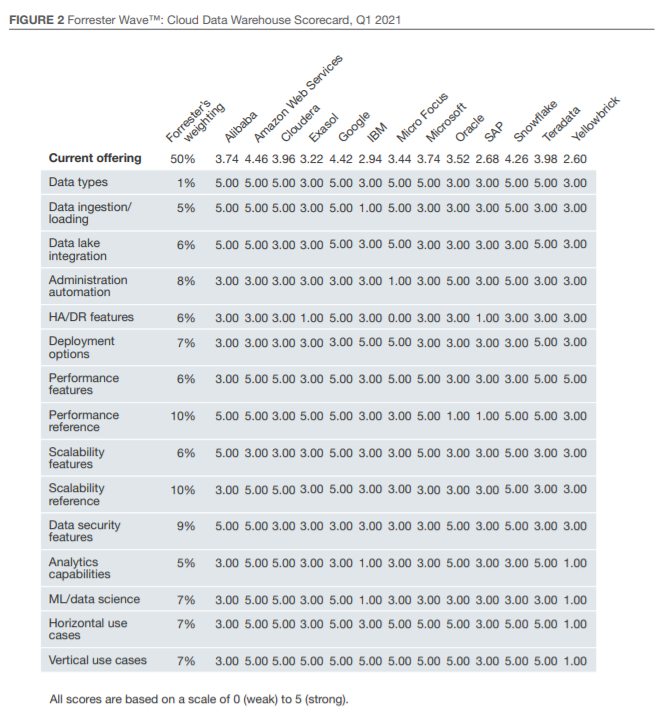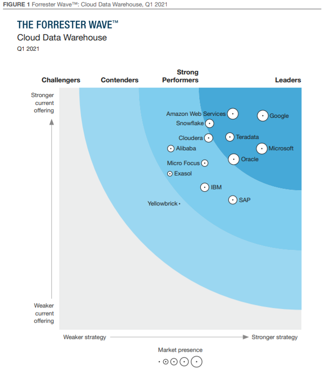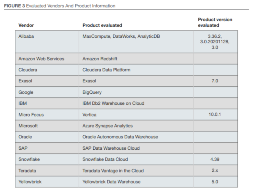Forrester Wave™评估报告着重介绍了领导者、强劲表现者、竞争者和挑战者。它评估了市场上的主要供应商,并不代表整个供应商生态圈。Forrester的初衷是该评估仅作为一个起点,鼓励客户使用基于Excel的供应商比较工具查看产品评估并调优标准权重。Forrester Wave™:云数据仓库,2021年