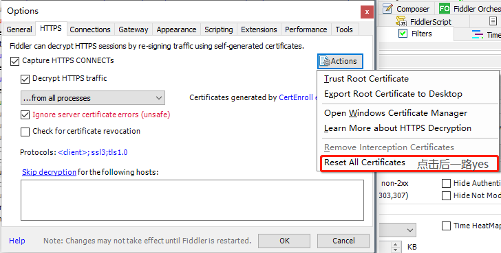 Tools > Fiddler Options > HTTPS:勾选 Decrypt HTTPS Traffic | Ignore server certificate errors(unsafe)