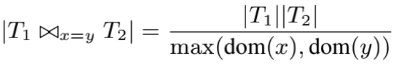 左边表示 T1 和 T2 在 x 和 y 列进行 join 的结果行数,右边的 |T1| 表示 T1 表的行数,dom(x) 表示这一列的 NDV(number of distinct values);