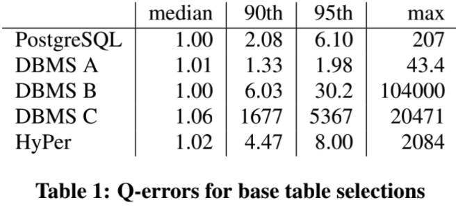 2. 所有 DB 都可能出现误差验证的情况,即 max(q-error) 较大;