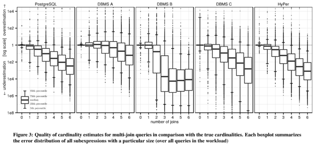 作者把 113 个查询,导入了 5 个 DB(PG、Hyper、3 个商业 DB),然后导出了他们所有的中间估算结果。