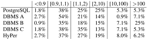 1. 和最优计划(使用真实基数)比起来,所有 DB 中大部分查询执行时间都显著变长,也就是比值 >= 1.1 的部分,这反向展示出估算误差对查询时间的影响;
