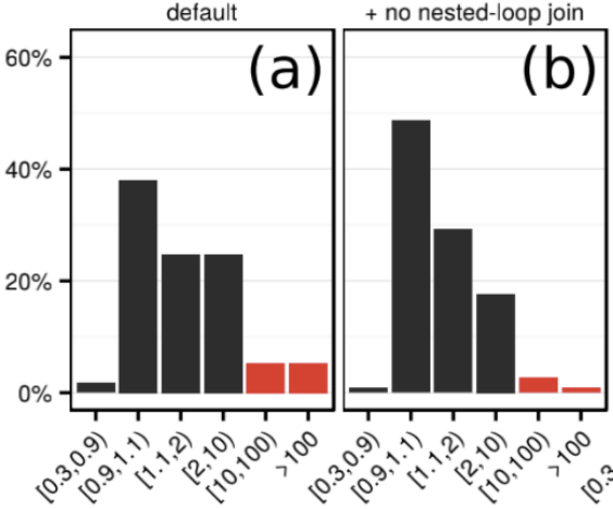 接着分析上述实验中,耗时增加严重的那些查询,也就是 >=10 的部分,发现大部分都是由于把 HashJoin 选错成 NestedLoopJoin 造成的。