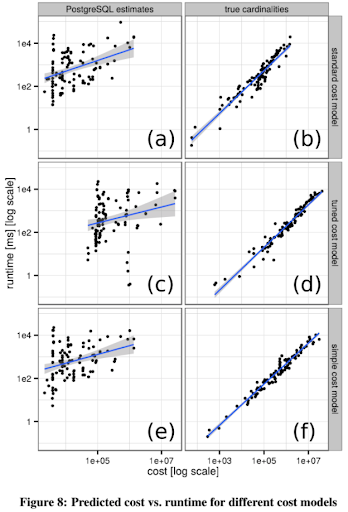 有了 join 顺序,作者并没有真实的执行,因为从上小节的实验来看,在使用真实基数的情况下,代价模型已经能比较准确的反映执行时间,于是作者直接计算了他们的代价,作为标准来衡量执行时间;