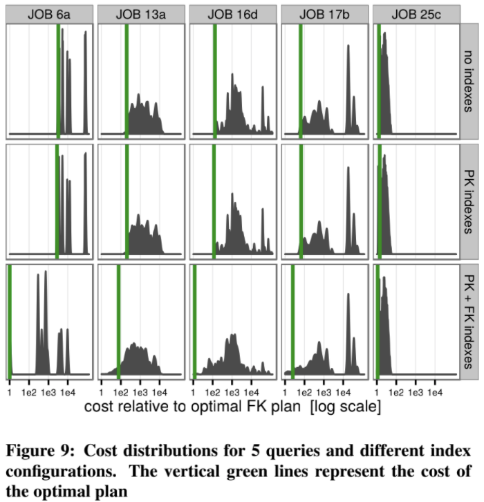 观察所有图的分布,最好的 join 顺序比最差的好处几个数量级,可见 join 顺序对执行时间的影响巨大;