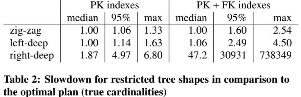 用这三种模式的遍历结果,和最优的 join 顺序(通过原有的 DP 算法得到,可能是 bushy-tree)做比,得到下面的结果: