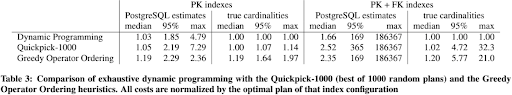 2. Quick-1000:对每个查询随机产生 1000 种 join 顺序,然后选取其中代价最小的;