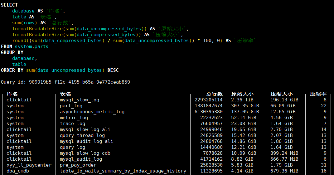formatReadableSize(sum(data_compressed_bytes)) AS `压缩大小`,