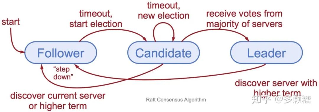 Candidate:用来选举新的 Leader,处于 Leader 和 Follower 之间的暂时状态;