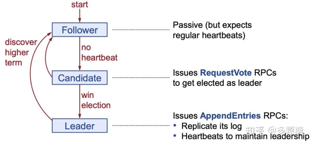 Follower:完全被动的(不发送 RPC,只响应收到的 RPC)——大多数服务器在大多数情况下处于此状态;