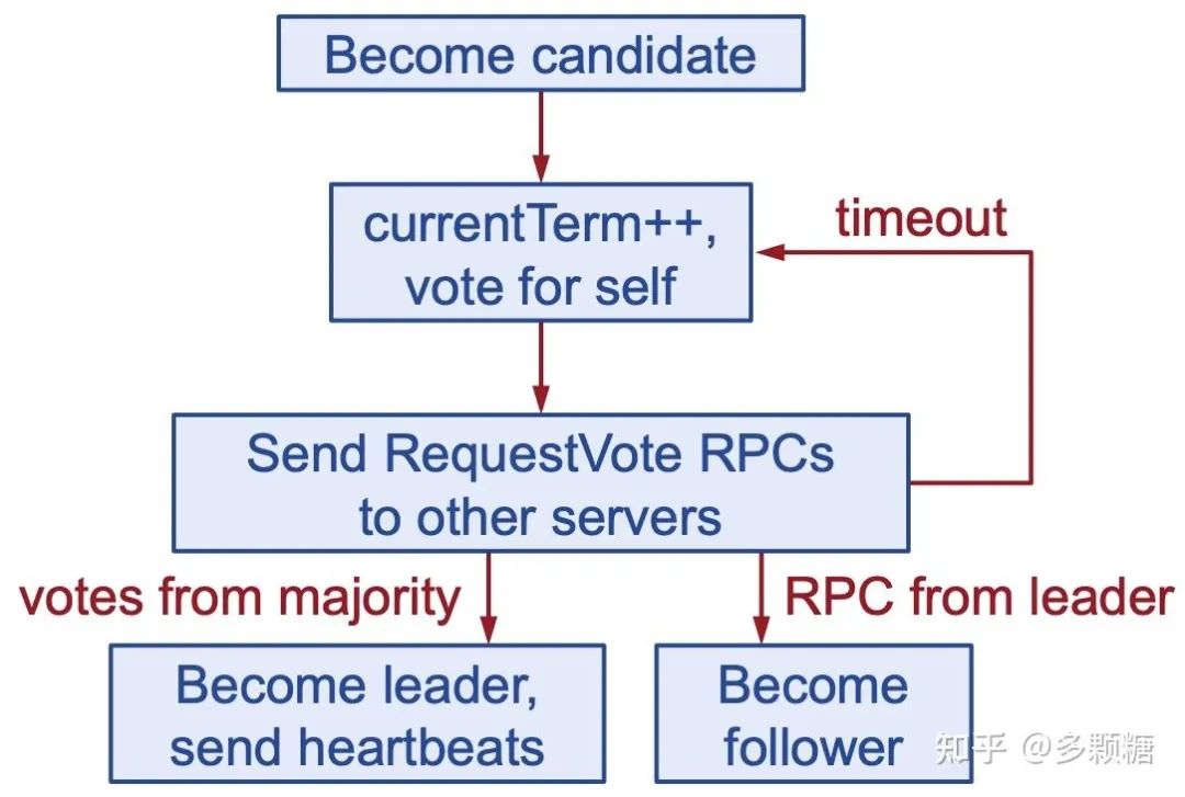 currentTerm转为 Candidate 状态,其目标是获取超过半数节点的选票,让自己成为 Leader;