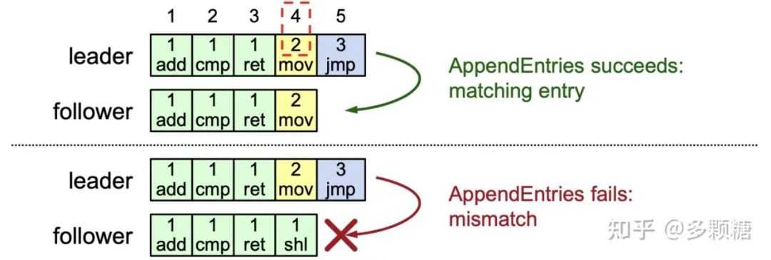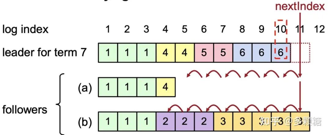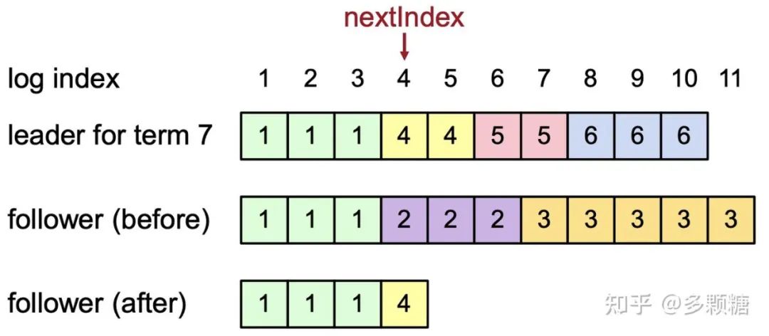 = 4 才匹配。值得注意的是,对于 b 这种情况,当 Follower 覆盖不一致的日志时,它将删除所有后续的日志记录(任何无关紧要的记录之后的记录也都是无关紧要的)。如下图所示: