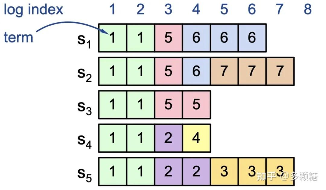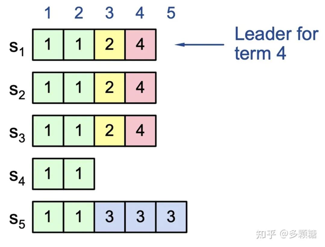 如图所示的情况,在任期 2 时记录仅写在 S1 和 S2 两个节点上,由于某种原因,任期 3 的 Leader S5 并不知道这些记录,S5 创建了自己的三条记录然后宕机了,然后任期 4 的 Leader S1 被选出,S1 试图与其它服务器的日志进行匹配。因此它复制了任期 2 的日志到 S3。