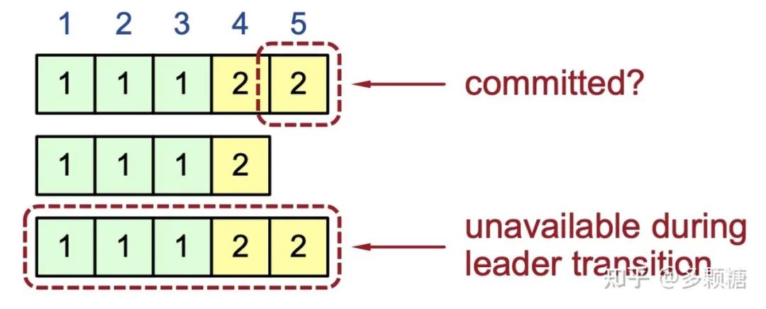 因为 S1 可能在此时宕机,然后 S5 可能从 S2、S3、S4 获得选票成为任期 5 的 Leader。一旦 S5 成为新 Leader,它将覆盖 index=3-5 的日志,S1-S3 的这些记录都将消失。