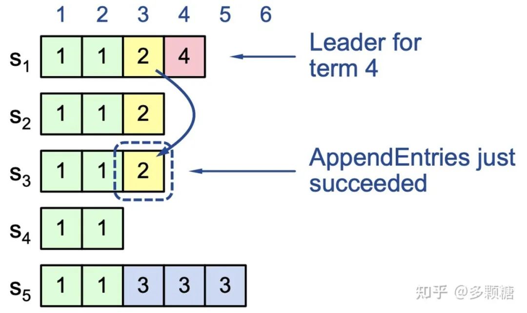 任期 2 的 Leader S1 的 index = 4 日志刚刚被复制到 S3,并且 Leader 可以看到 index = 4 已复制到超过半数的服务器,那么该日志可以提交,并且安全地应用到状态机。