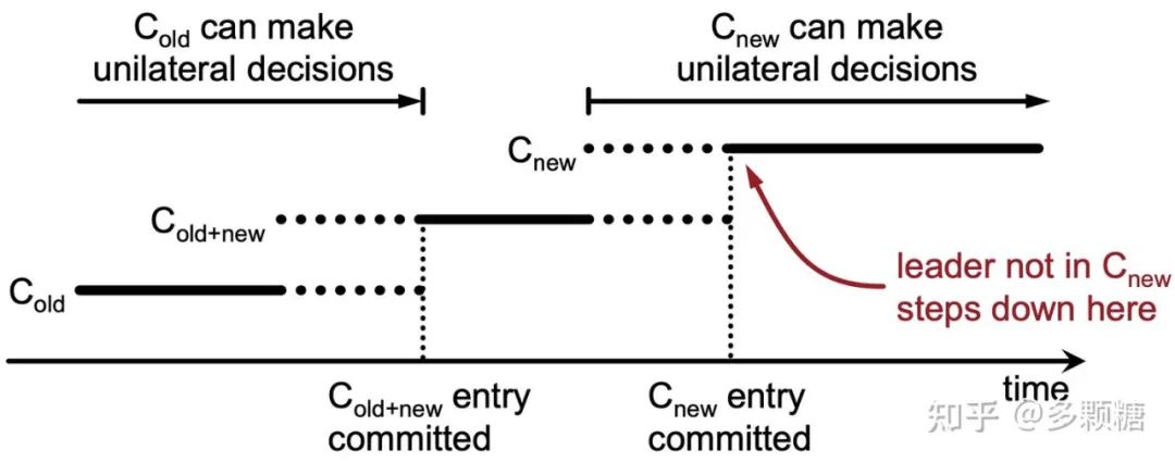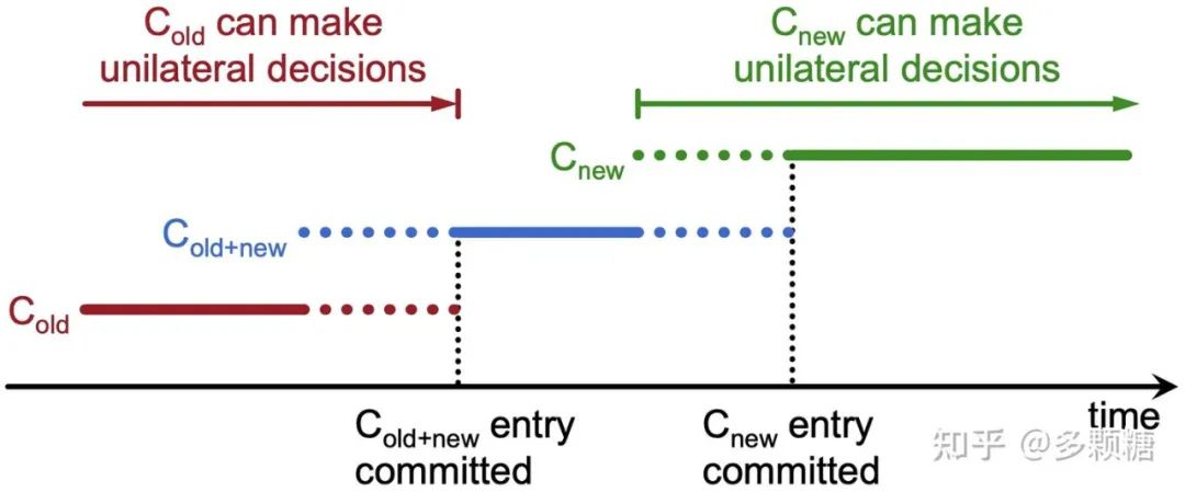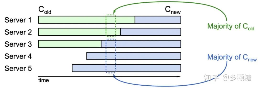 Cold+new 日志已提交保证了后续任何 Leader 一定有 Cold+new 日志,Leader 选举过程必须获得旧配置中的多数派和新配置中的多数派同时投票。