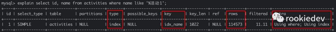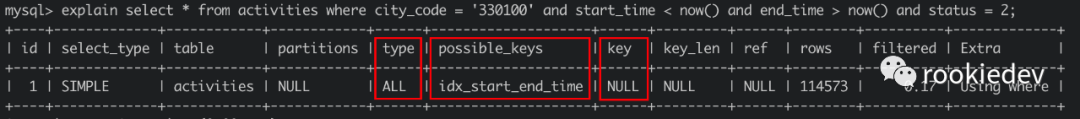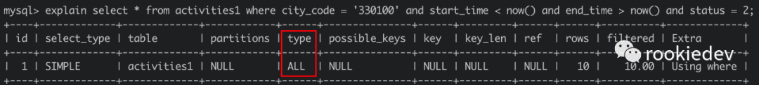 如果直接这样去执行,肯定是全表扫描,explain 的执行结果 type 列的值是 all,刚开始数据量不大,当然也是可以接受的,但随着活动创建的越来越多直接全表扫描肯定就不行了,所以在一开始我们就要考虑好该怎么去建索引。