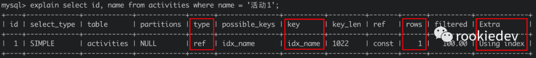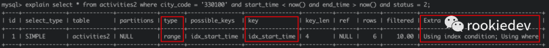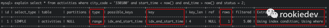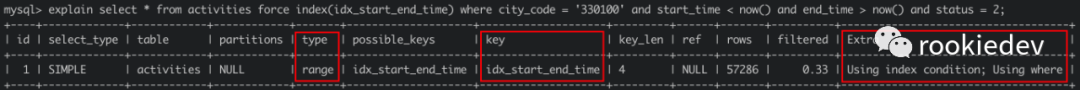 上面 activities1 是没建索引的表结构,activities2 是建了索引的表结构,里面的数据是一样的,可以看到建了索引之后的查询也确实使用了索引 idx_start_time,同时 Extra 里面还出现了 Using index condition; Using where 的信息, 说明这里还使用了索引下推的优化。