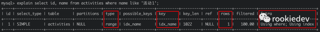 同样还是以 activities 表为例,然后在 name 字段上建立索引,现在有下面五个 SQL 语句: