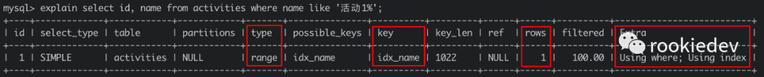 第二个 SQL 的查询和第一个不同的是 type 类型是 range,使用的索引是 idx_name,预估扫描行数也是 1,同时 Extra 里面也有 Using index 的信息,同样使用上了索引覆盖的优化,同时还有 Using where 的信息,和上面我提到的范围查询涉及到 Index Key 的提取规则场景应该是一样的。