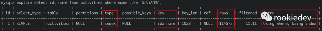 通过分析其实也不难发现,首先可以看到 possible_keys 字段里面确实有出现 idx_start_end_time,说明 MySQL 知道有这个索引的存在,但在评估之后没有去使用,再一个可以看到 rows 字段中预估要扫描的行数多达 11 万多。