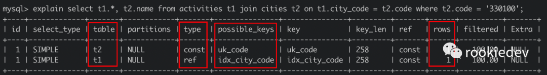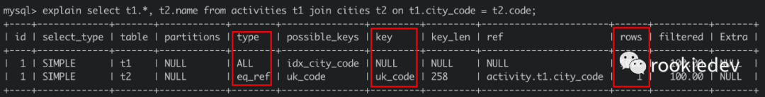 接下来再来看另一种直接进行 join 联表查,通过城市编码字段进行关联查询,对应 SQL explain 结果如下: