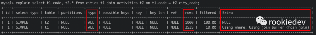 接下来看第二个问题,同时如果你仔细看的话会发现,我故意将 SQL 语句中 join 表的顺序调换了,将 cities 表放在前面,从 SQL 语句看起来应该是 cities 作为驱动表,activities 表作为被驱动表才对,但从 explain 的执行结果来看,MySQL 没有按照我们书写的顺序来进行执行。