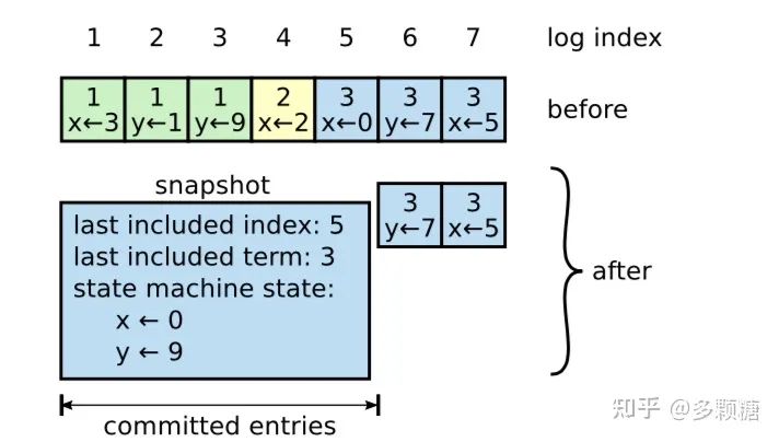 一旦日志记录被提交并应用于状态机,那么用于到达当前状态的中间状态和操作就不再需要了,它们可以被压缩掉。