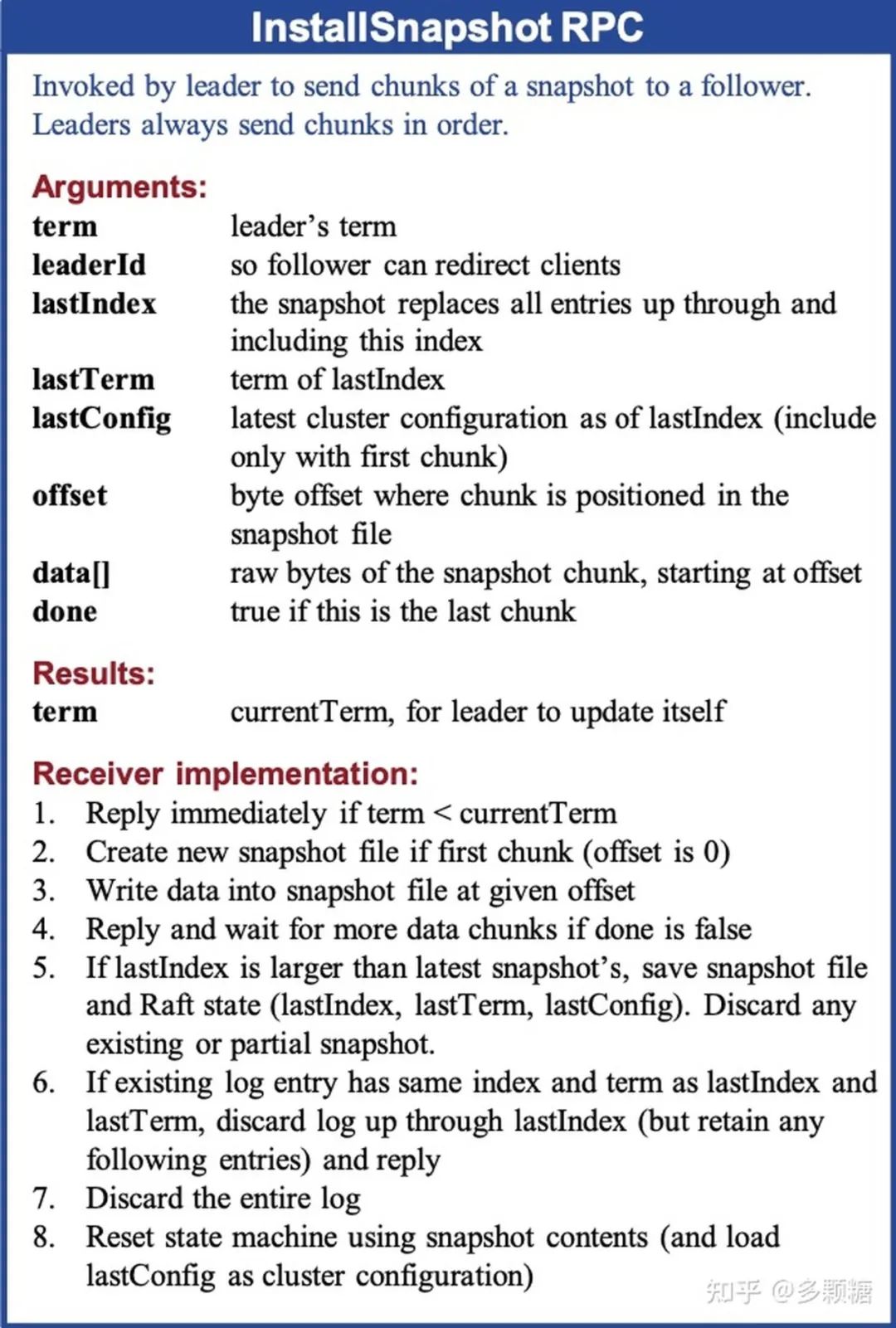 通过上面的介绍,Leader 可能偶尔需要把它的状态发送给慢 Followers 或新加入集群的服务器。快照信息通过 InstallSnapshot RPC