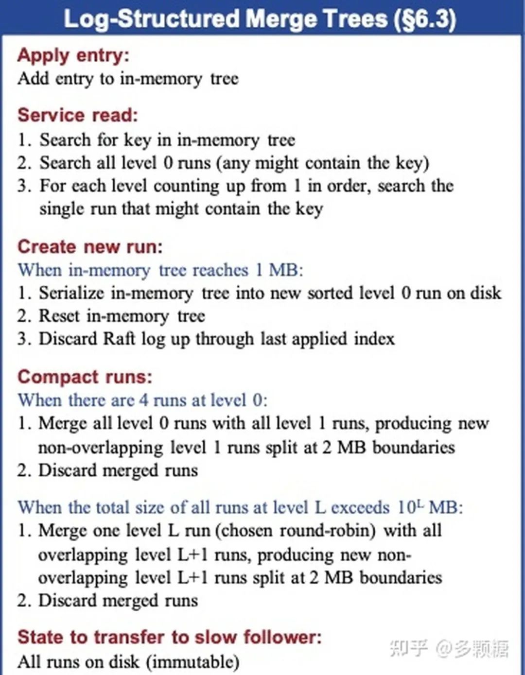 典型的 LSM tree 将最近的写入在磁盘上保持一份小的 log。当 log 达到一定的大小后,对 key 进行排序并且写入一个叫做 run 的文件中。Runs 不会 in-place 修改,但是会周期性地对 runs 进行 merge,产生新的 runs 并丢弃旧的,merge 的过程像 merge sort。