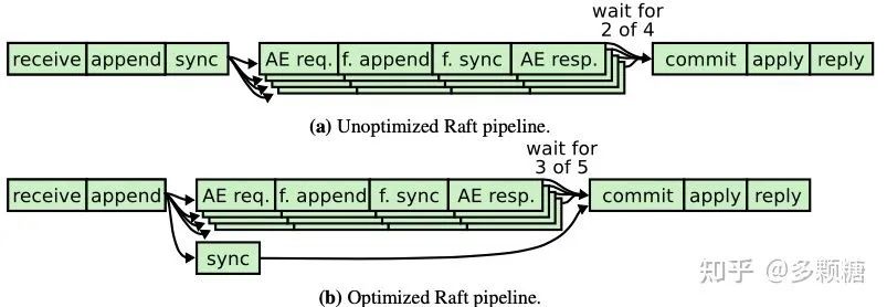 在前面的实现中,Leader 将日志写到磁盘后,再将该日志复制到它的 Follower,然后等待 Follower 将该日志写到他们的磁盘上。这里出现了两次连续的磁盘写入等待,这将导致显著的延迟。