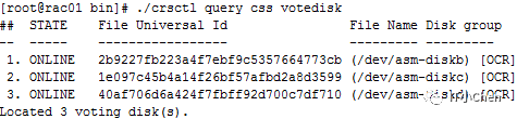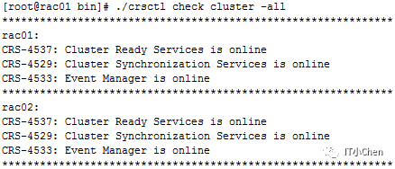 [root@rac01 bin]# ./crsctl check crsCRS-4638: Oracle High Availability Services is onlineCRS-4537: Cluster Ready Services is onlineCRS-4529: Cluster Synchronization Services is online