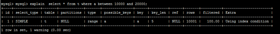 首先我们来看,该查询使用了range扫描方式,也就是使用了索引a的范围扫描,这个很容易理解到,mysql的优化器选择了a索引