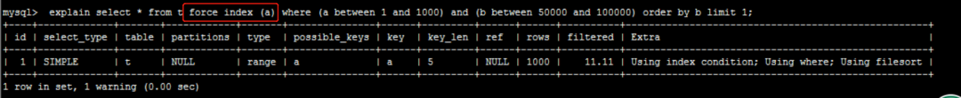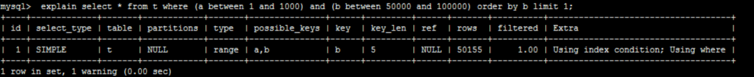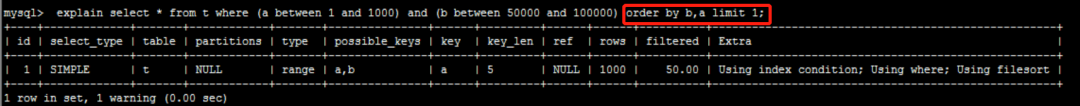 explain select * from t where (a between 1 and 1000) and(b between 50000 and 100000) order by b limit 1;