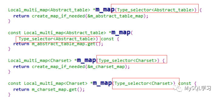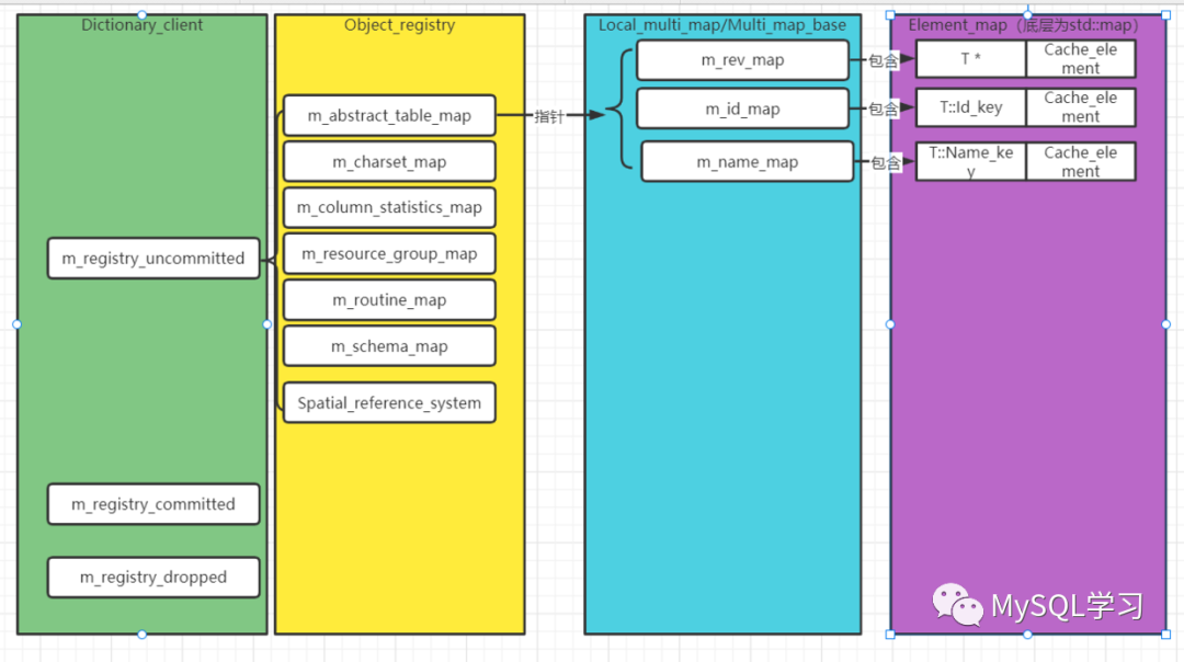 实际上这部分主要和DDL操作进行的状态转换有关,这里先不考虑了,因为原子化DDL没有学习过。但是从流程来看,一般select语句会加入到m_registry_committed中,并且查找也会在里面查找。那么总结一下,这里面包含3个Object_registry元素,每个元素包含多个Local_multi_map,而每个Local_multi_map是Multi_map_base的继承,每个Multi_map_base包含了4个map,其中3个常用,分别是主键/名字/元素的指针 为key,元素就是对应的Cache_element。Cache_element原则也是一个元素的指针。