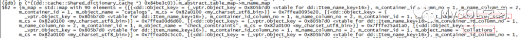 我们访问就是 名字(key) - value(Cache_element) 这样一个map,因为是名字比较容易看。这里我们发现元素有90个,因为比较多,只显示了小部分,实际上有90个表的字典都缓存在了Shared_dictionary_cache中。