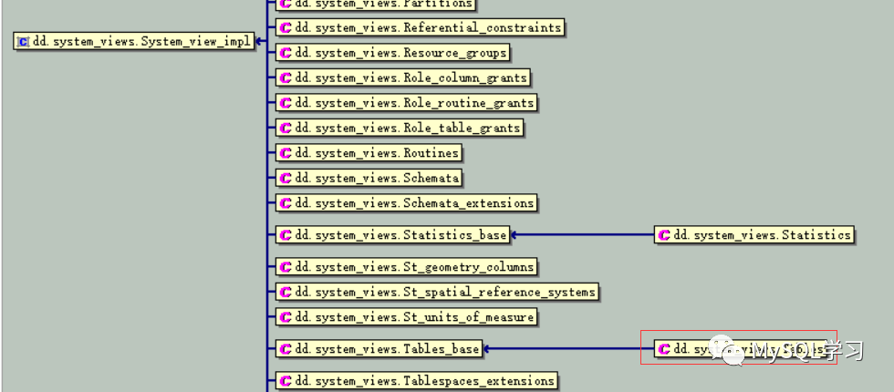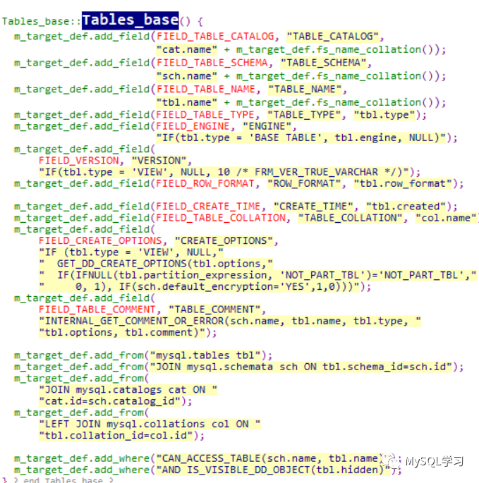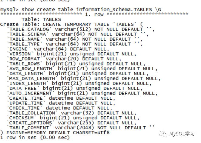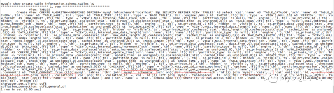 他们就是上面cache的实际数据的存储。其次如果我们试图查看information_schema里面表的定义我们也能够发现,其中大部分为视图,其来源就是这些内部表,比如information_schema.tables这个视图,如下: