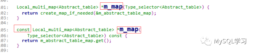 const函数重载,同上,我们可以发现他们函数的名字都是相同的,但是统一类型的map的 m_map函数有带const的又不带,不同的含义,当需要新建的时候(分配map的内存给指针)就需要不带const的,比如map的put方法,如果只是map的get方法,那么就需要带const的函数,这样就返回其指针。