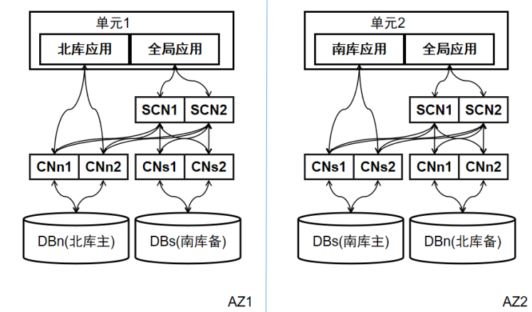 方案由全局计算节点(SCN)对接南北库的计算节点(CN)而成。在相应的计算节点上实现就近读,高可靠高可用等特点,如图2所示。使用新方案后,应用单元内部的跨库查询逻辑可以将之前的“获取不同集群数据”,“对不同数据进行归并处理”,“在某个集群数据获取出现意外之后的异常处理”逻辑全部去除,直接对SCN发送跨库查询语句即可。大大降低了业务复杂度,提升了业务性能。