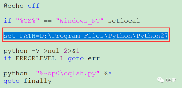 解决:安装Python 2,修改文件D:\Program Files\apache-cassandra-3.4-bin\apache-cassandra-3.4\bin\cqlsh.bat,添加一行:set PATH=D:\Program Files\Python\Python27,如下: