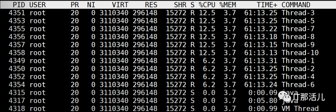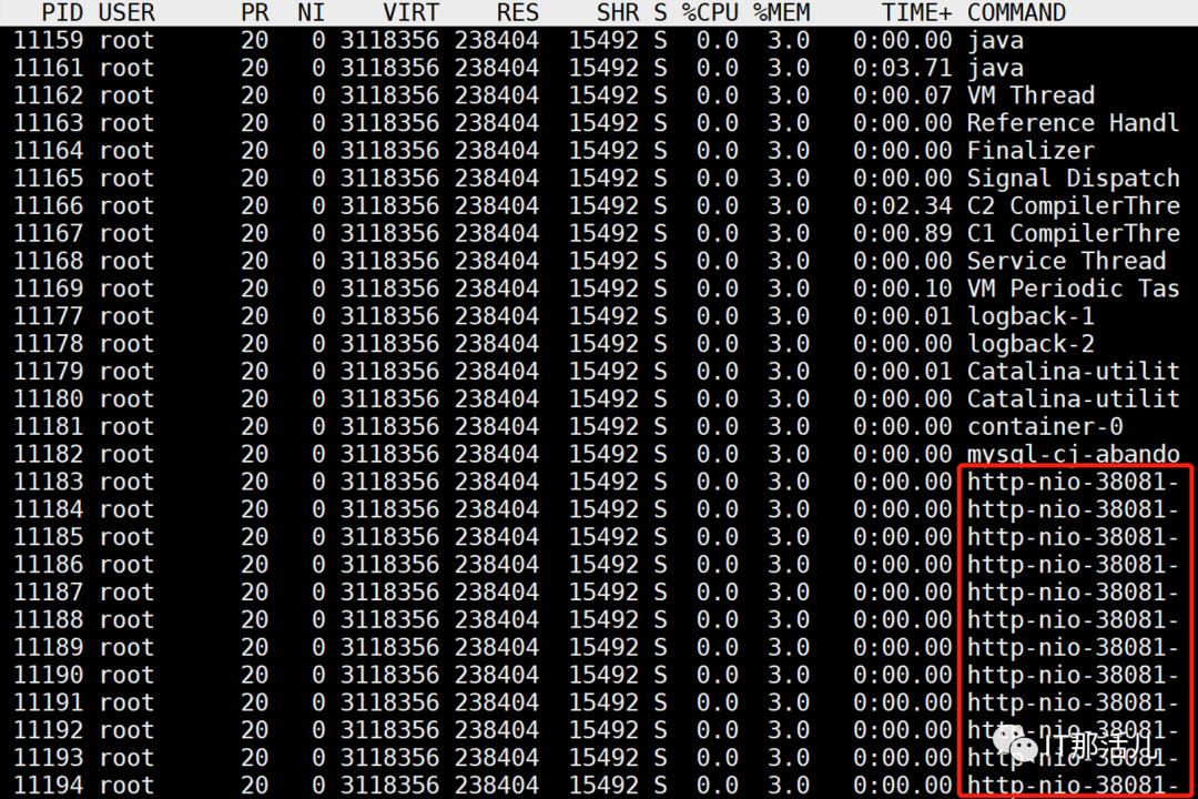 1. 另外一种情况是可能线程占用资源不是很多,但线程数量过多,海量线程数累计占用了过多资源导致CPU过高,同样使用top命令定位问题进程.2. 再通过top -Hp 11159查看到异常线程.4. 使用jstack 11159 | grep 0x2baf -A 30查看到该线程状态为WATTING,过多的等待状态线程可能是代码中锁了资源导致线程一直处于等待状态.5. 本案例代码中是使用了suspend()方法挂起线程,又没有恢复导致的多线程等待,在程序设计时需要注意避免死锁的产生.