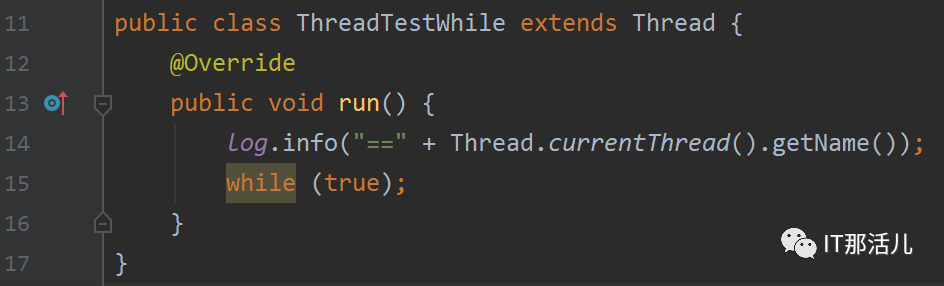 可查看线程状态查找关键字向下30行内容,可看到线程状态为RUNNABLE,根据下列内容定位到代码ThreadTestWhile.java第15行。5. 查看代码逻辑,第15行为死循环,就是它导致了线程一直在运行,占用了过高CPU资源,修改该死循环即可解决问题.