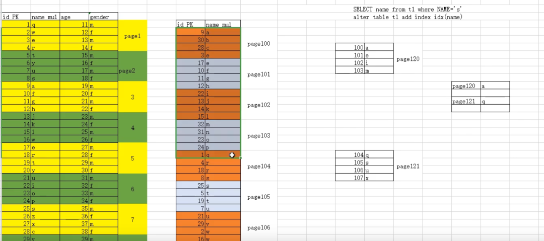 其B+树结构如图,name字段建立了一个索引,辅助索引的叶子节点带有主键值和该列值,如果是联合索引,则多对应的层数,支节点(name)之后还有支节点(age)..,多层构建成一颗辅助索引B+tree,所以,联合索引遵循最佳左前缀匹配原则,因为,一旦跳过最上层的支节点,也就无法一层一层定位到需要查找的数据,就只能全表扫描或者index全索引扫描,这也是联合索引如果中间某个字段进行了范围查找,那么其后面的列也就无法走到索引的原因。