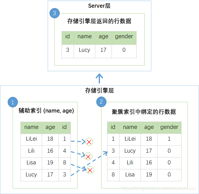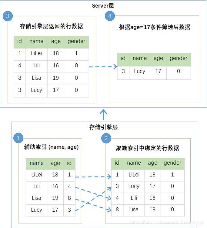 在使用索引下推的情况下,存储引擎层还是先根据 name like 'L%' 这个条件,查找到 LiLei、Lili、Lisa、Lucy 四条索引数据,不过接下来不是直接进行回表操作,而是根据 age = 17 这个条件,对四条索引数据进行判断筛选,将符合条件的索引对应的 id 进行回表扫描,最终将找到的行数据返回给 server 层。(也就是我们把本应该在 server 层进行筛选的条件,下推到存储引擎层来进行筛选判断了。这个下推的前提是索引中有 age 列信息,如果是其它条件,如 gender = 0,这个即使下推下来也没用)